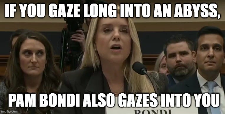 There were the 15 questions that the Epstein survivors wanted answered at Pam Bondi's hearing today. I think it would have been worth examining each one if she had actually given a straight answer to any of them.