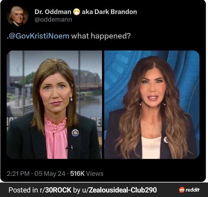 Okay everyone, it's 5:35am here in my neck of the woods. Its Kristi Noem day. SEND YOUR BEST MEMES, ARTICLES, JOKES etc far and wide! Send to Twitter, Facebook, reddit and anywhere else. I'll start!